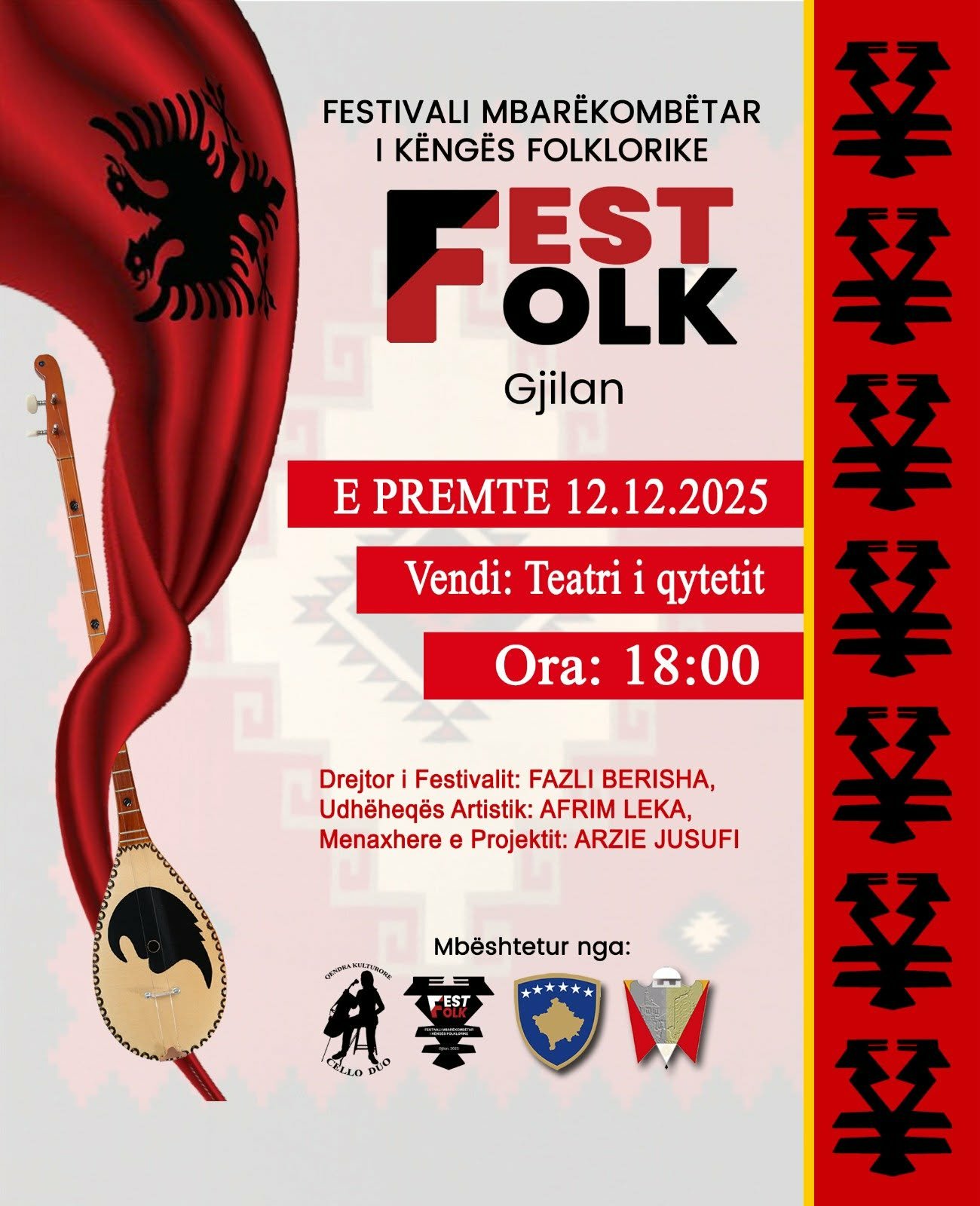 Sonte, në Teatrin e Qytetit në Gjilan, do të mbahet festivali mbarëkombëtar i këngës folklorike “Fest Folk – Gjilan”, një ngjarje kulturore që mbledh këngëtarë nga Kosova, Shqipëria, Lugina e Preshevës dhe Maqedonia e Veriut.