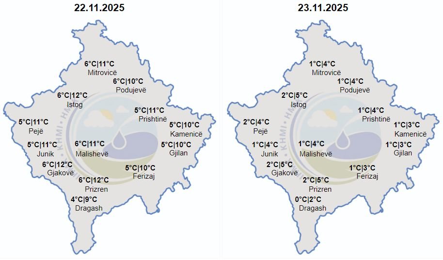 Temperaturat minimale do të lëvizin ndërmjet 0 deri 2 gradë Celsius, ndërsa maksimalet e ditës parashihen të lëvizin ndërmjet 2-5 gradë Celsius.