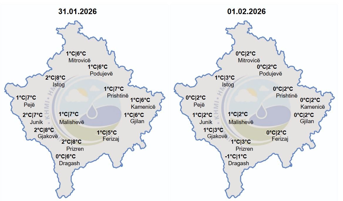 Mot: kryesisht i vranët, me riga shiu dhe reshje bore Temperaturat: minimale -1–1°C, maksimale 1–3°C Era: nga verilindja, 1–7 m/s