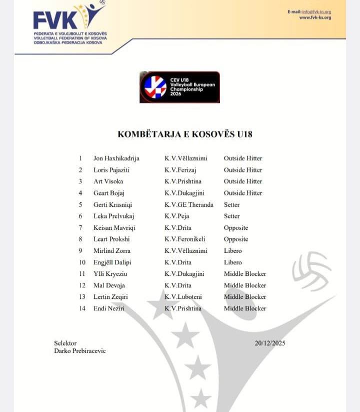 Tre volejbollistë të rinj dhe me perspektivë nga KV Drita janë ftuar për përfaqësuesen e Kosovës U18, siç është bërë e ditur nga lista e publikuar nga Federata e Volejbollit e Kosovës.